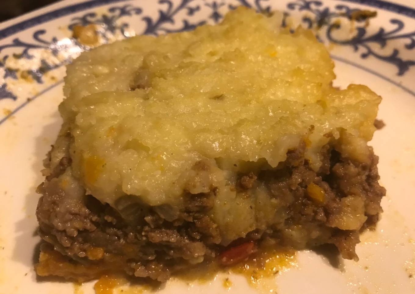 - Ubicar el puré de calabaza en la base, luego la preparación de la carne y encima el puré de papas y espolvorear con queso rallado