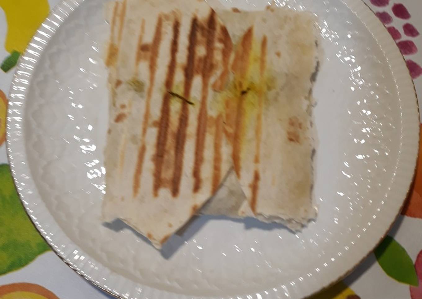 - Mojamos la tortita con un poco de agua. Extendemos la tortita encima de un plato. Colocaremos una loncha de queso, jamón serrano, brotes de brócoli. Espolvorear pimienta negra y cúrcuma en polvo. Un chorrito de aceite de oliva.
