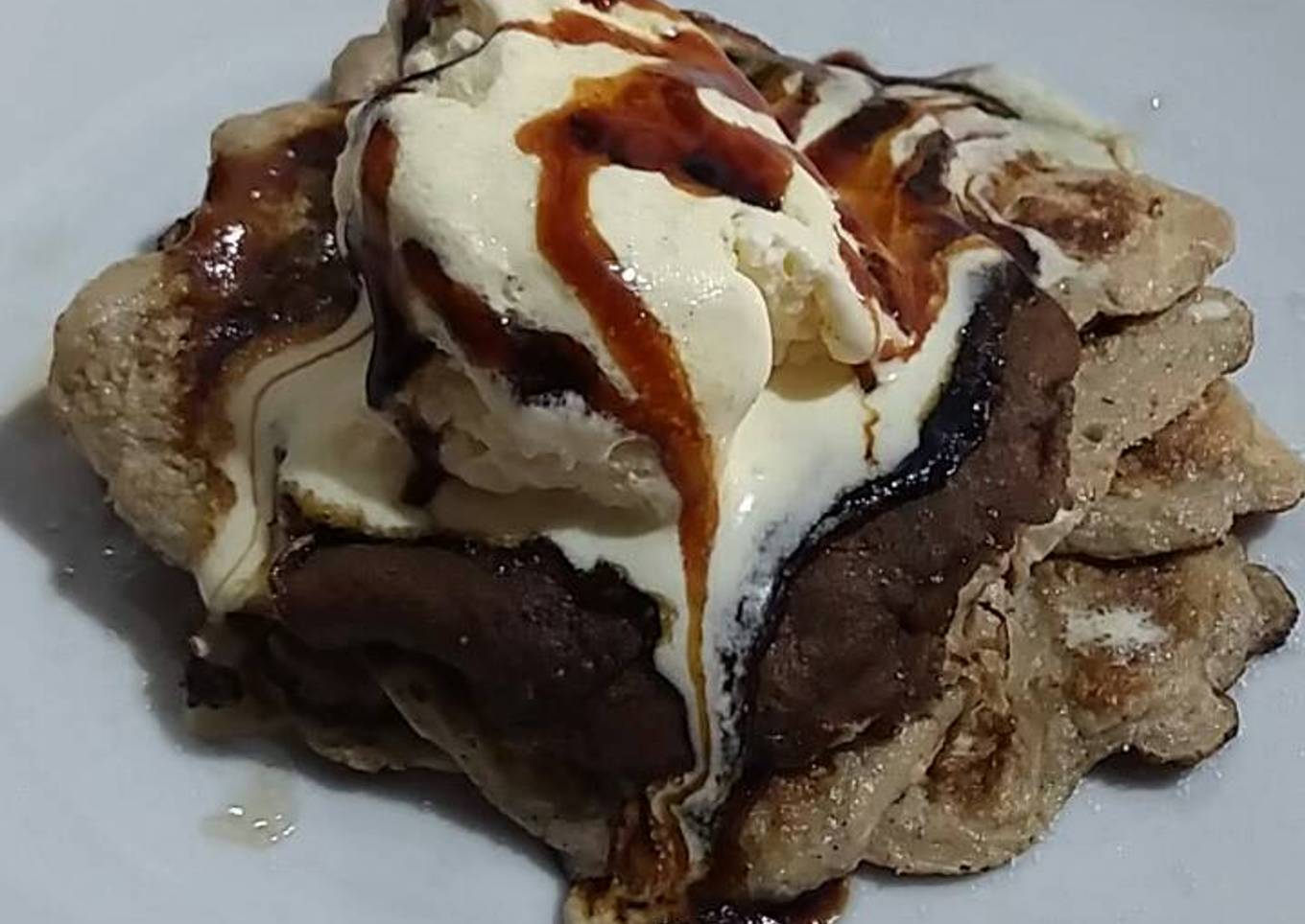 - En un plato ponemos las tortitas unas encima de las otras, ponemos una bola de helado de vainilla, ponemos un poco de azúcar de vainilla y lo bañamos con caramelo al gusto.
